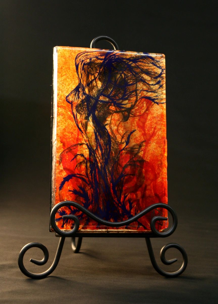 Through her work, Bridget aims to invoke emotion in the viewer, focusing on themes she holds dear, such as renewal and transformation. She achieves this by creating elements in glass using a variety of methods such as glass painting with enamels and vitreous paints, screen printing on glass, and powder painting, then layers and fuses these various elements together much the same way she layered elements on the computer for visual effects. Often, Bridget will explore one image, experimenting with a variety of colors, layering & style, much in the same way she would approach creating a visual effects shot for film.